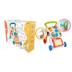 - Столешница. Производители делают столешницу максимально функциональной. К ней крепится разные игрушки, есть отделения для бутылочки и т.д. Чем больше дополнительных аксессуаров у ходунков, тем будет выше их цена.