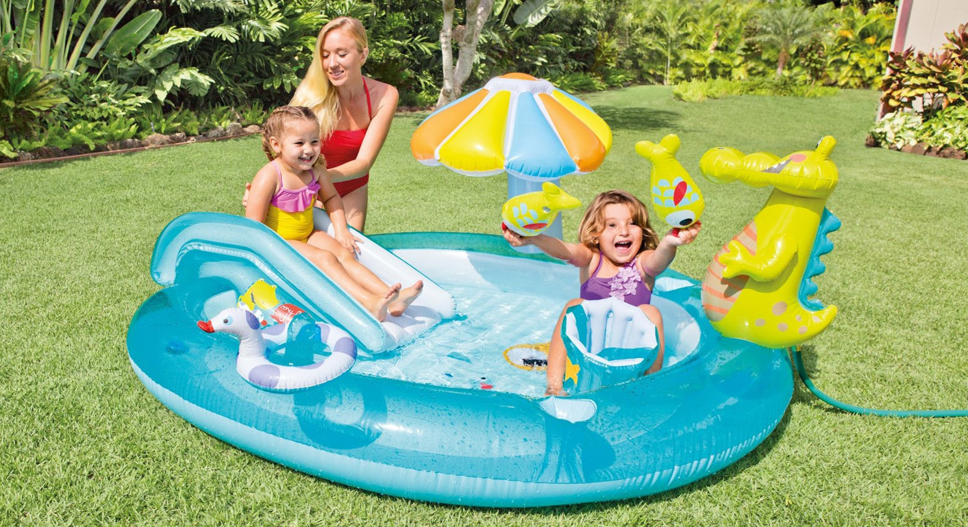10 Надувний ігровий центр Мій сад із фонтаном, Інтекс (код 127596). Це модель для тих, хто хоче створити оригінальну ігрову зону для дитини вдома. Ігровий центр складається з двох круглих басейнів, з'єднаних між собою надувною гіркою. Одна з частин басейну доповнена надувною веселкою з фонтаном на вершині. Здається, у цій моделі є все, що потрібно для відпочинку у спекотний літній день! Дитина може просто відпочивати у воді, спускатися з гірки або хлюпатися у фонтанчику. Бортики басейну прикрашені об'ємними надувними грибочками, деревами та парканчиком. Надувний центр виготовлений із міцного вінілу. Це ідеальне рішення для відпочинку дітей віком від двох років і старше.