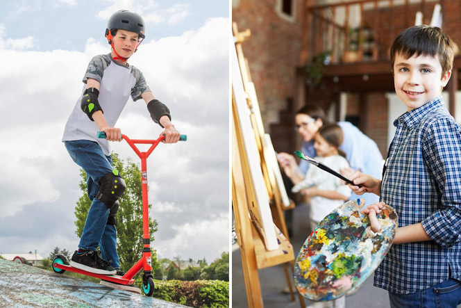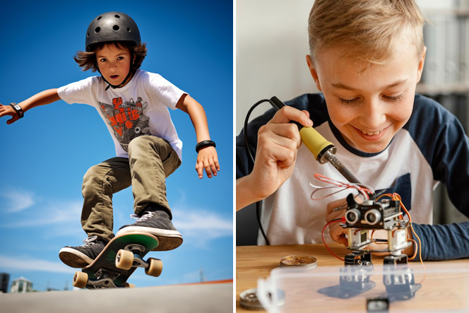 - скейтборд. Катання на скейтборді завжди в моді. Дека з колесами навчить дитину утримувати рівновагу, швидко реагувати на зміну обстановки і, звичайно, допоможе легко знайти нових друзів. Зі скейтбордом дитина зможе піти в скейтпарк та швидко знайти нові знайомства за інтересами;
